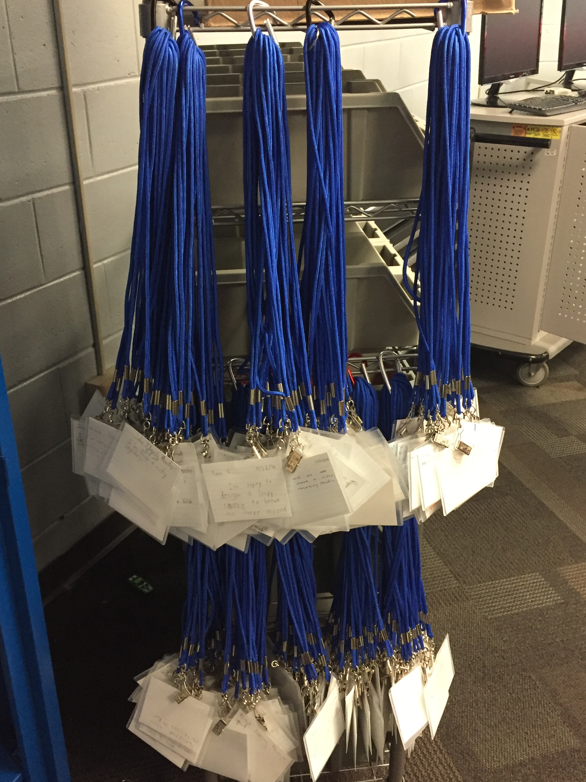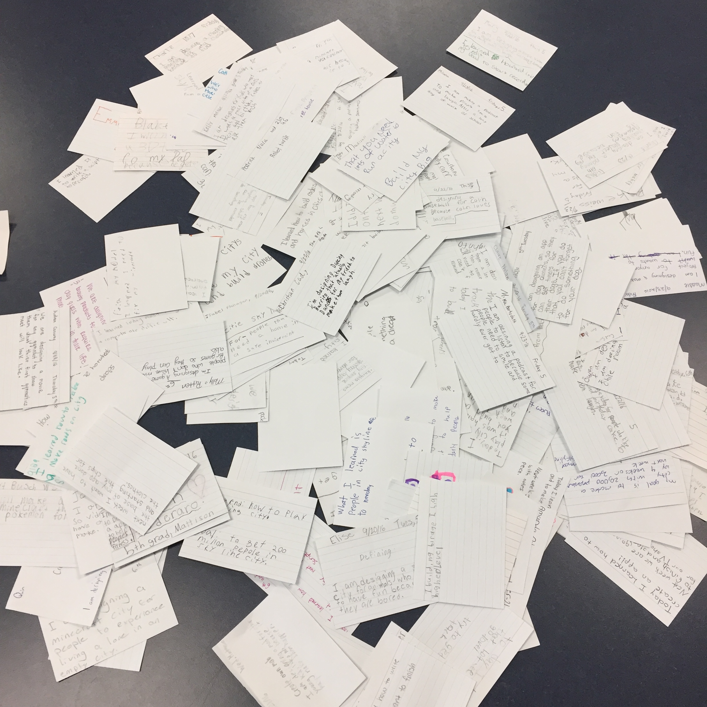 Lanyards. Our Innovators physically wear lanyards during Innovation Lab. The lanyards have proven to be the best method for holding kids accountable that we’ve ever come up with. Part 1: when students enter the Lab, they grab their lanyard and an index card. On the front of the index card, students write their challenge statement. The challenge statement, part of the (re)define stage of our design thinking process, is a one sentence declaration of what students are designing, for who, and why. For example, “I’m designing a grocery reminder app for my mom because she always forgets something at the store,” would be an example of a good challenge statement. Once they’ve written their challenge statement on the index card at the beginning of class, they put their lanyard on and get to work.