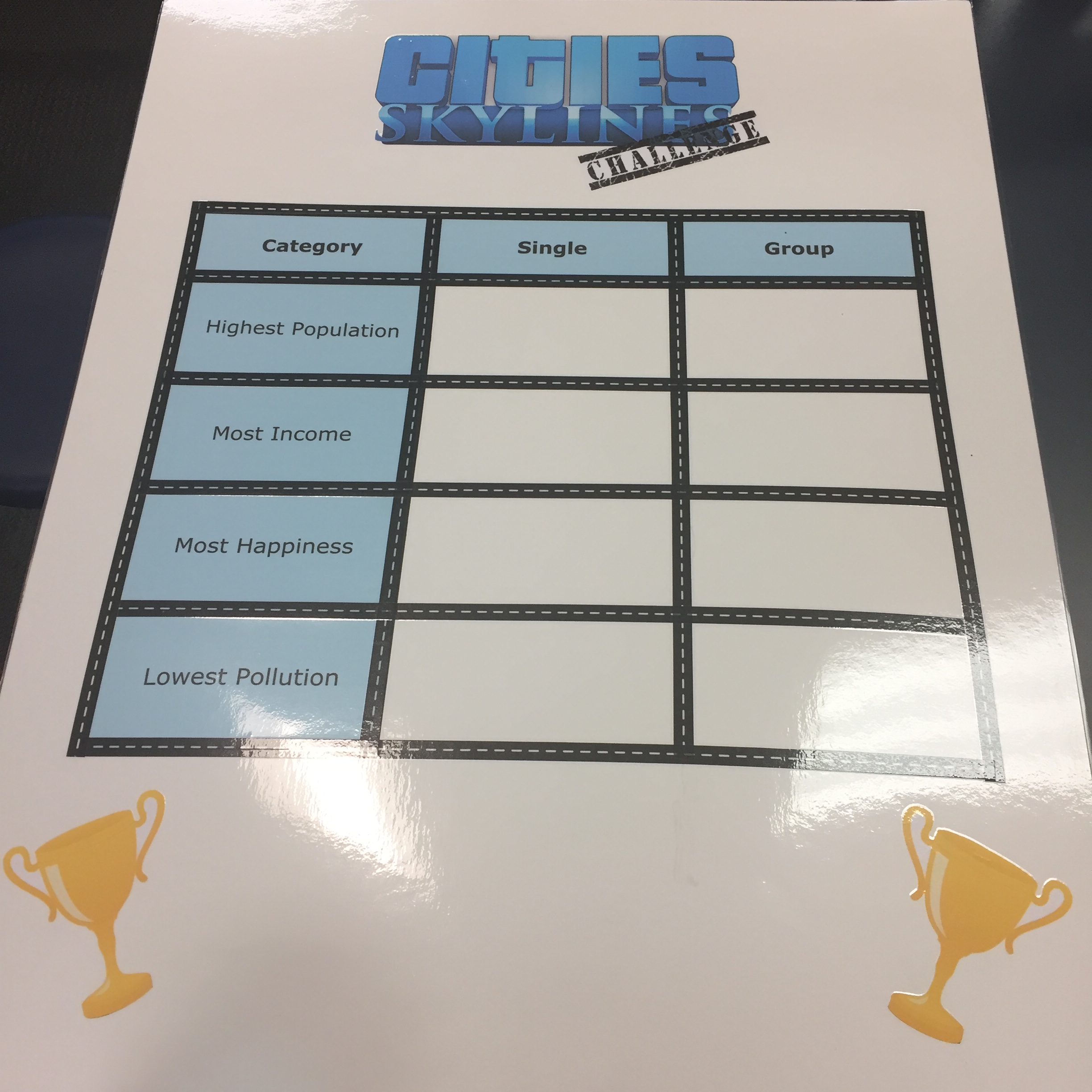 Competition. We were lucky to have Hot Wheels send us a Speedometry Kit and bunch of great video game companies like Paradox Interactive and Mohawk Games gift us some great learning AAA games. Ms. Smith and I make posters to hang on the wall that track some of the design challenges students can tackle in the Lab. Challenges like highest population, happiest population, lowest pollution, longest jump, most loops made, allow competition between classes which have many of our kids running to class to see if they still hold the record. I love gamification, so I try to use these types of game mechanics where I can to motivate students to keep them moving forward.