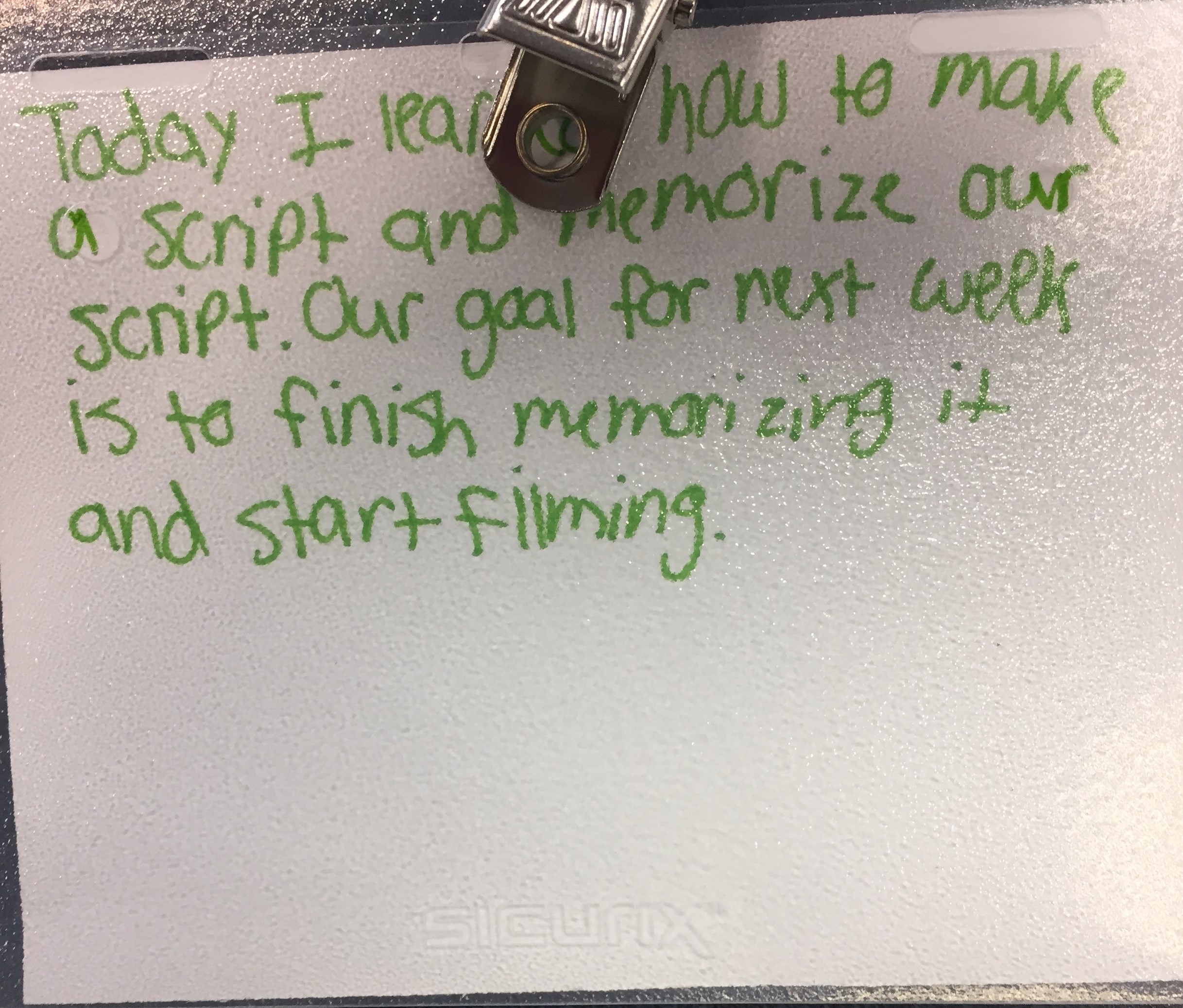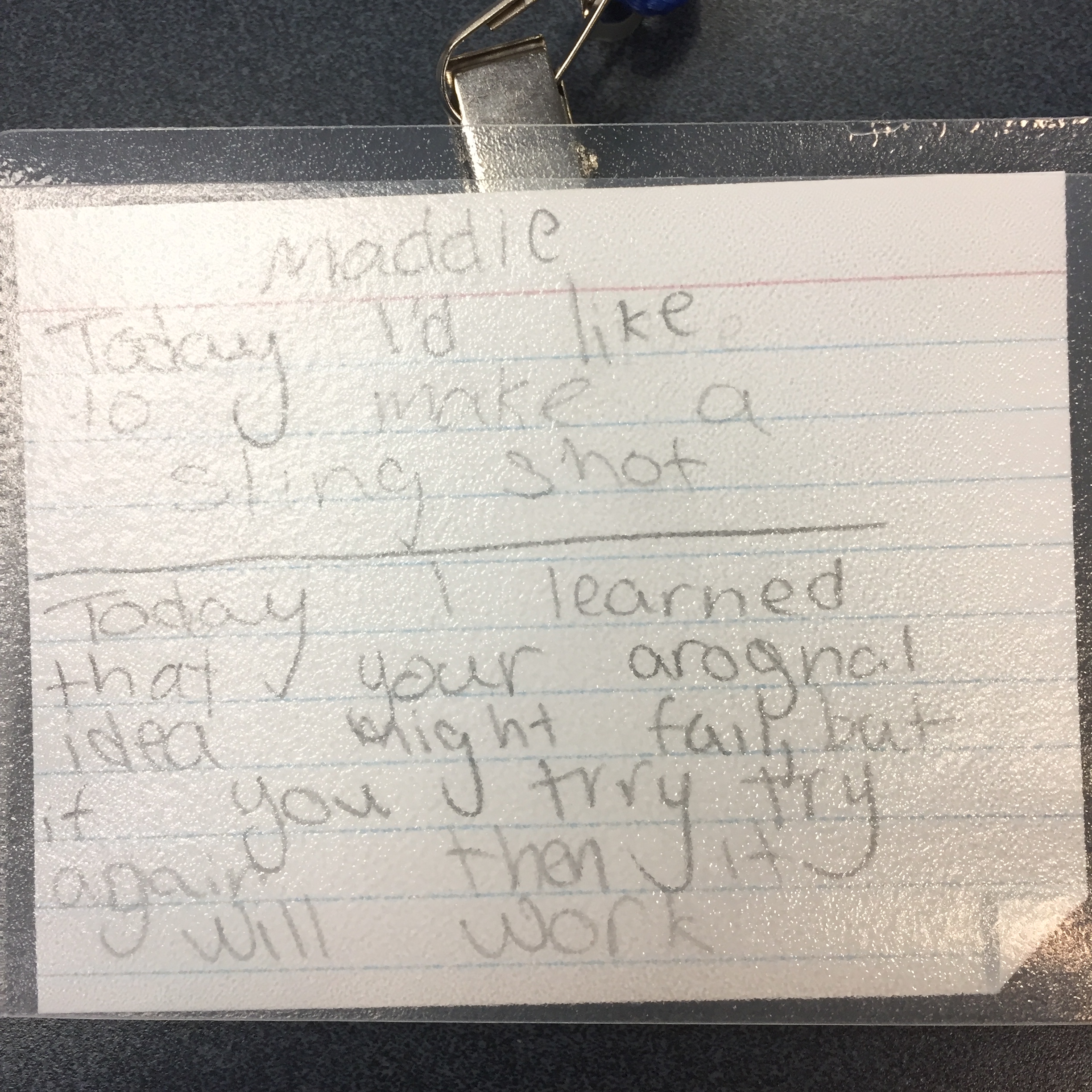 Part 2: during the last five minutes of class, students take the index card out of their lanyard. On the back, students are expected to write their goal for next week and one thing they learned during Innovation Lab. When students come in the next week, we have them start by reading the goal they wrote last week and (re)defining their challenge statement again. This cycle continues each week. The lanyards help everyone stay focused, organized, and encourages students to work through our design thinking process. This lanyard system is the back bone of accountability in the Innovation Lab.